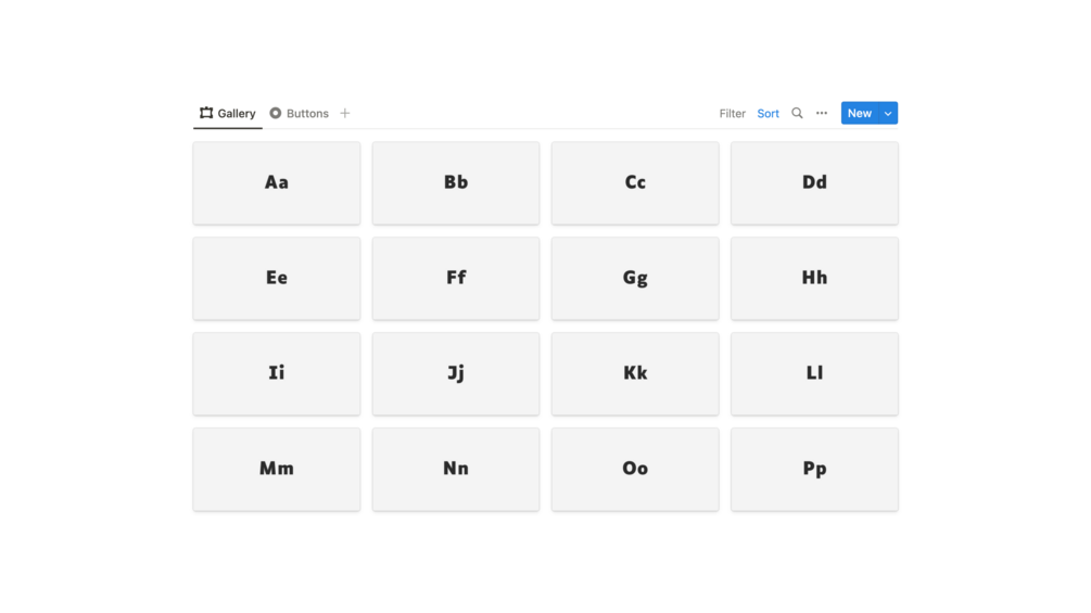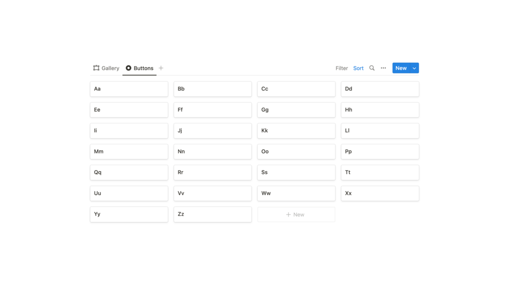 This Notion template is laid out in a simple, easy-to-read format. Each entry contains a single letter of the alphabet, making it easy to scan the database and find the alphabetical tag you're looking for.