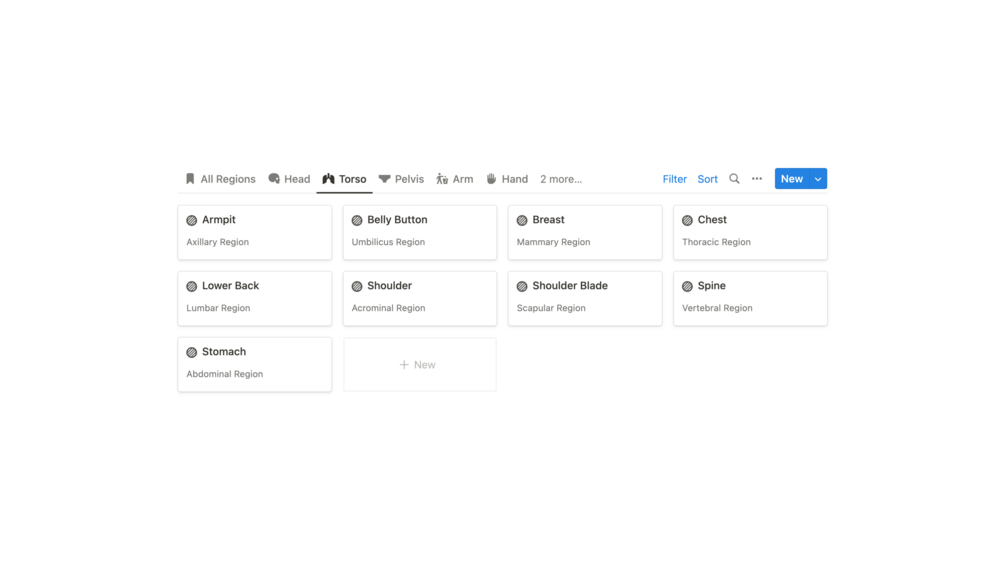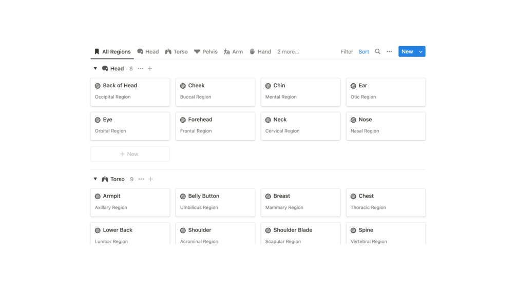 This Notion template can be customized as a resource for learning about the human body. It includes information on all common anatomical regions including head, torso, leg, arm, etc.