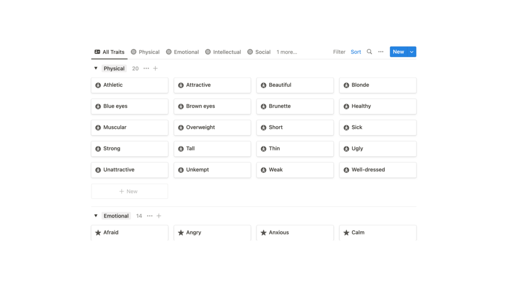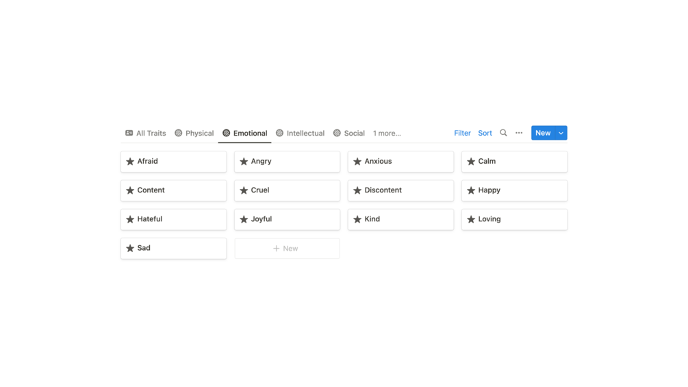 This Notion template includes a wide variety of physical, emotional, and intellectual traits. You can easily add new traits to the database, or customize the existing traits to fit your needs.