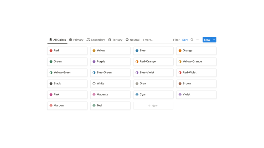 This Notion template includes a variety of primary and secondary colors, as well as a variety of colors that can be associated with other creative-themed databases. Great for an artist or web designer.