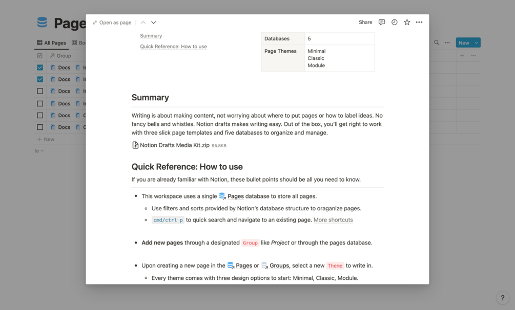Writing is about making content, not worrying about where to put pages or how to label ideas. No fancy bells and whistles. Notion drafts makes writing easy. Out of the box, you’ll get right to work with three slick page templates and five databases to organize and manage.