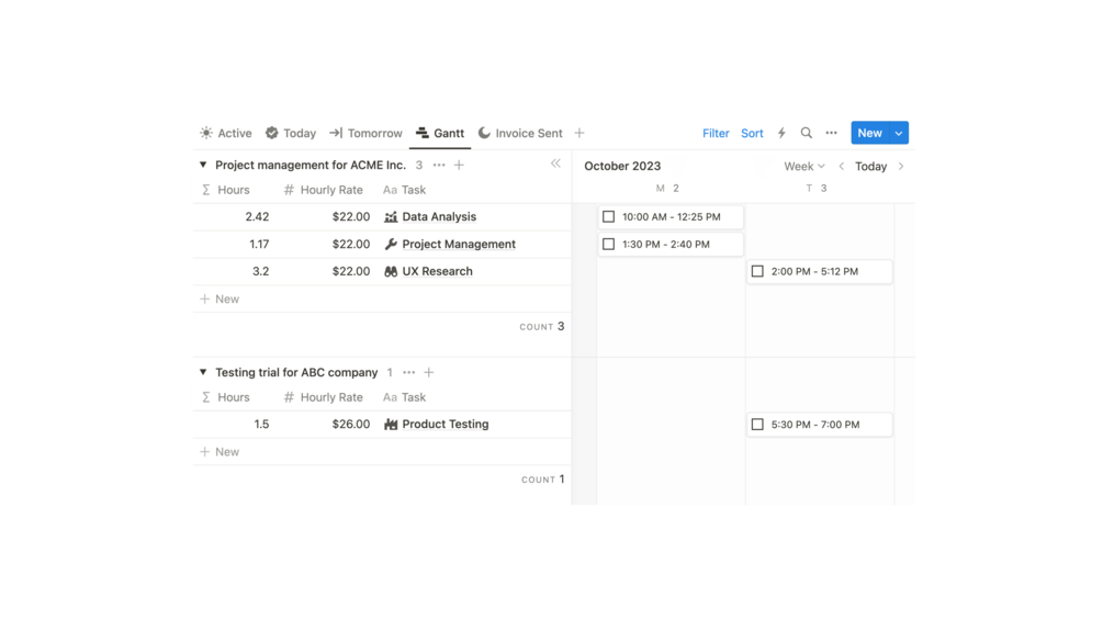 This Notion template is for freelancers and small businesses to easily manage their invoicing process with a straightforward timesheet. You can easily track tasks and projects and streamline the invoicing process.