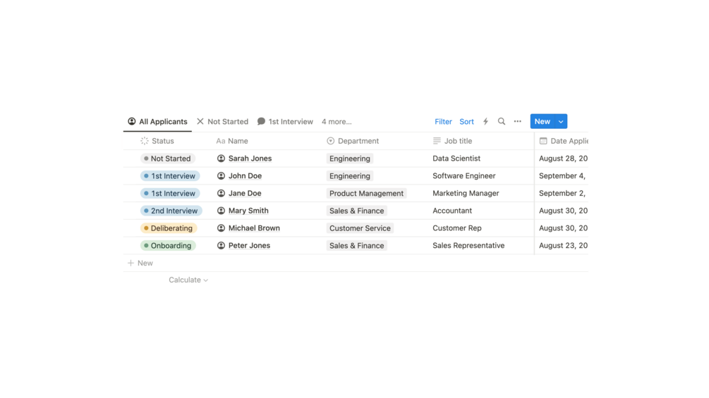A Notion database for HR departments to organize job applicants with 13 basic properties, 1 formula, and 1 page template