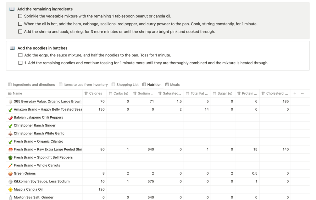 This is where all food items go, their inventory status from Full to Empty, and food type like Vegetable. You can add ingredients individually to the Meal Planner as well.